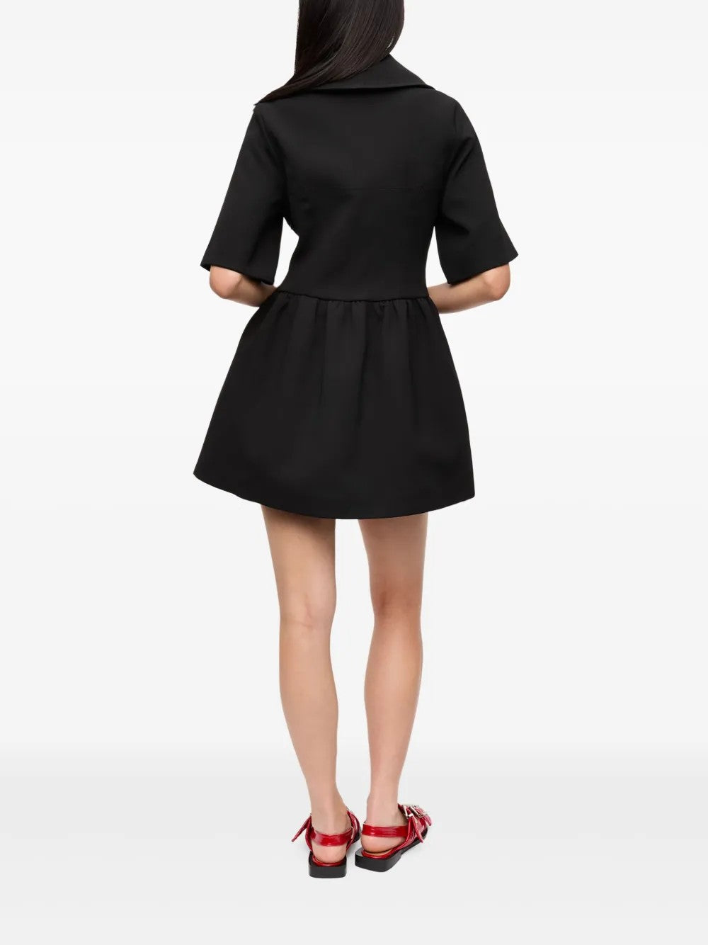 Questo abito mini Ganni in crepe nero si distingue per il maxi colletto che aggiunge un tocco di carattere e modernità.
